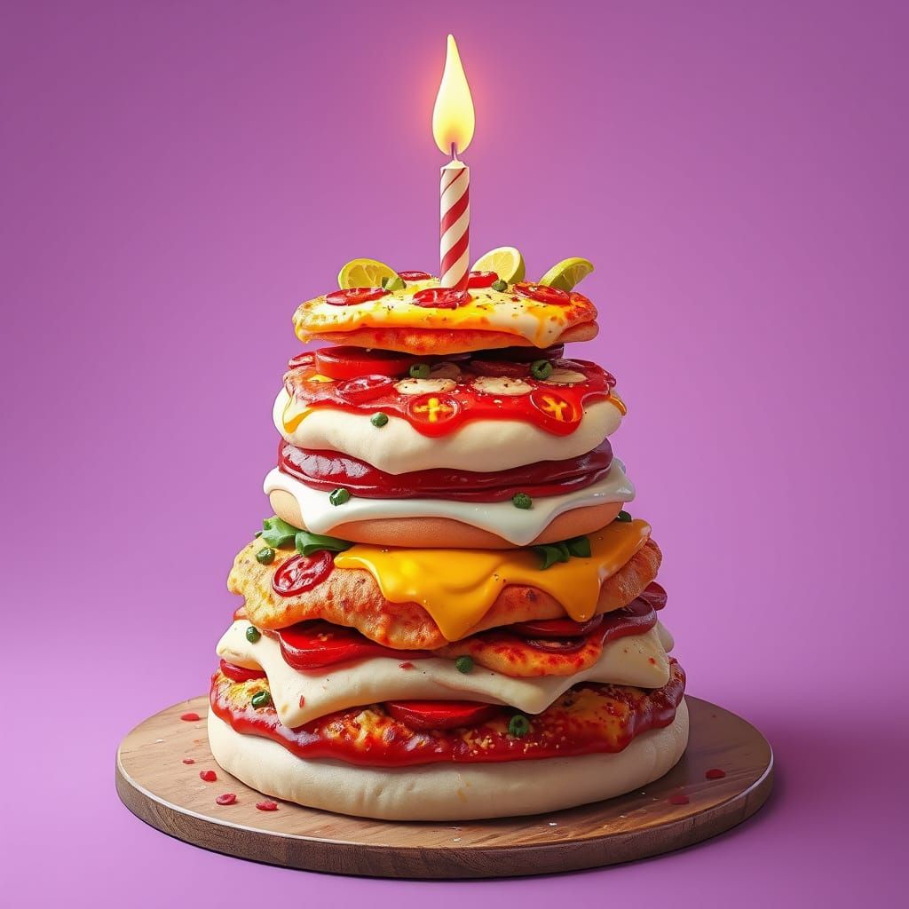 A whimsical pizza birthday cake towers with layers of dough, cheese, sauce, and toppings. The image is rendered as vibrant digital art with 3D elements.