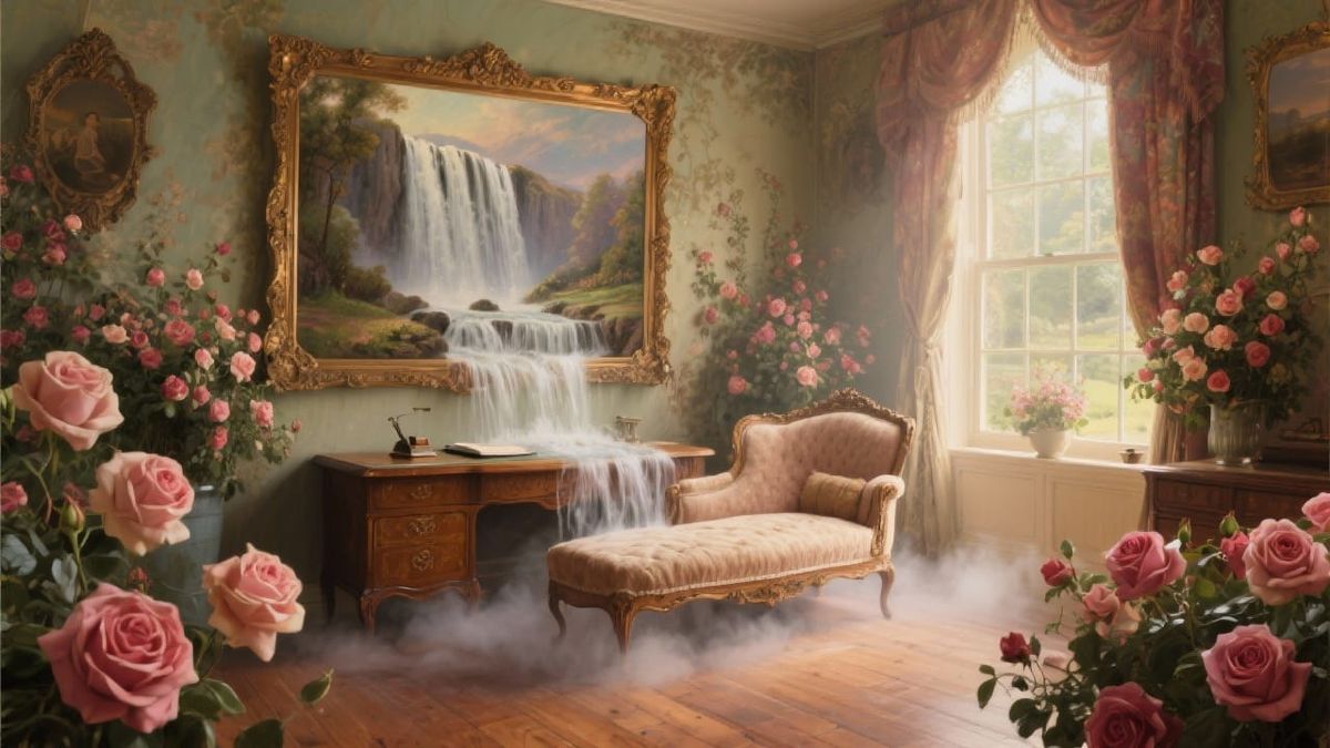 This image depicts a detailed Victorian parlor featuring a chaise lounge and writing desk. A painting of a waterfall flows out of its frame, creating a misty effect in warm, gentle light.