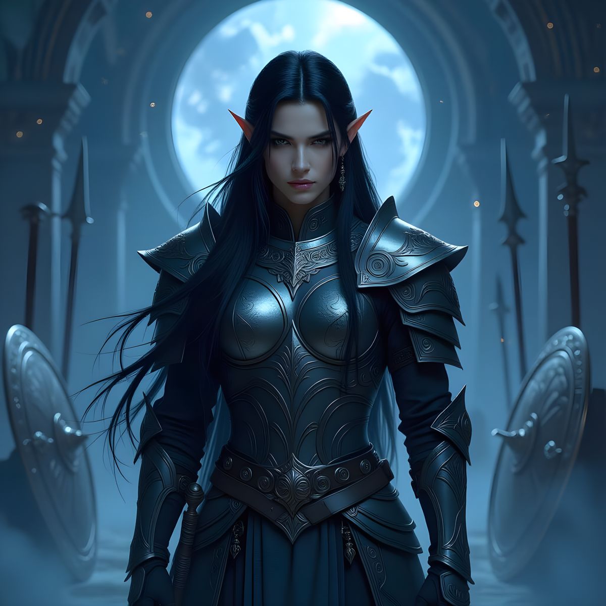 A hyper-realistic elven warrior stands in a misty armory. The warrior has long black hair, polished steel eyes and ornate armor. Soft galaxy glows illuminate ancient weapons in this art nouveau style image.