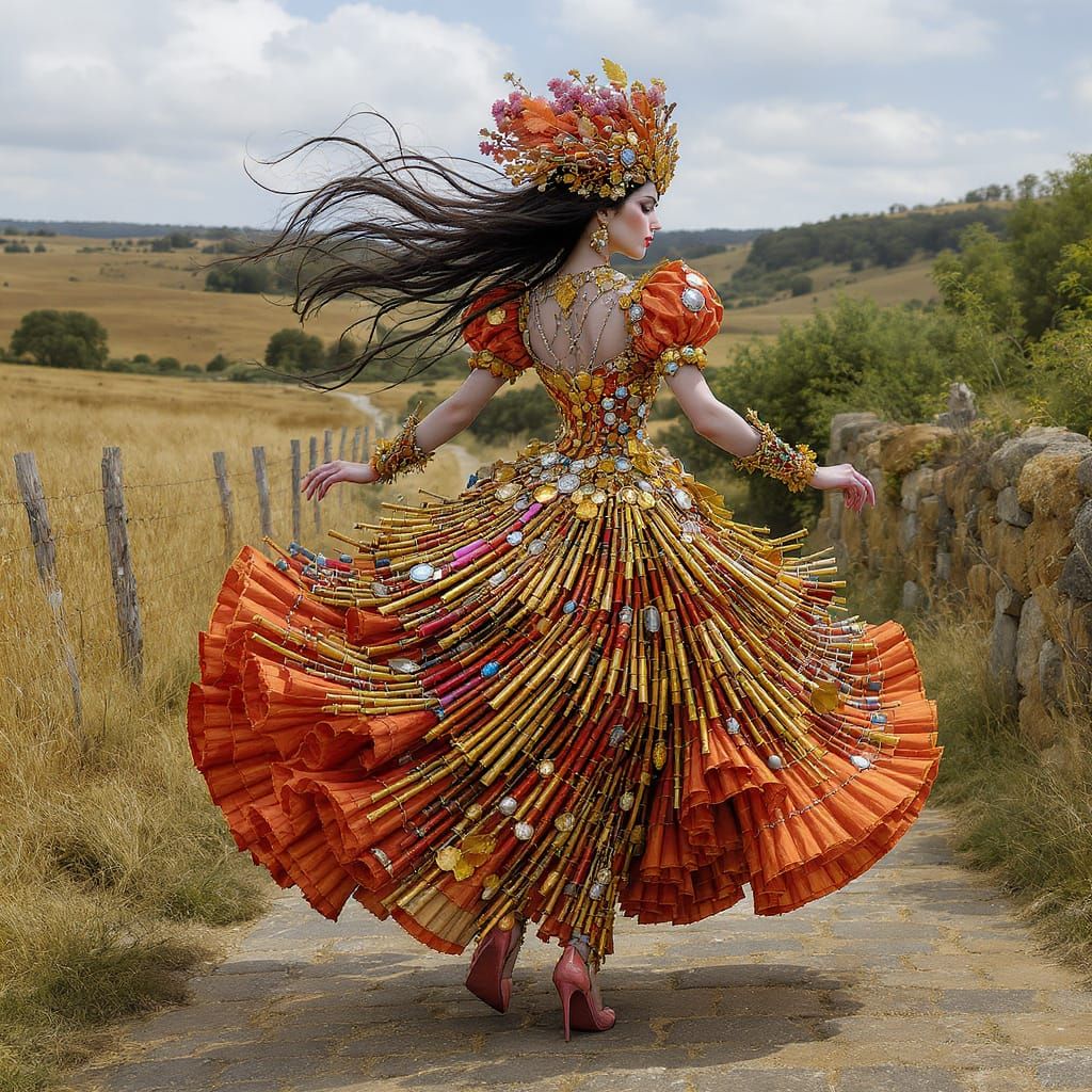 A fancy dress made in the style of Nick Cave sound suit, composed, entirely of trinkets, flutes, beads, silver, and gold leaves, :: swirling flowing, layered, as she dances down the cobblestone pathway along the rustic landscape, microdetailed, vibrant, colorful.