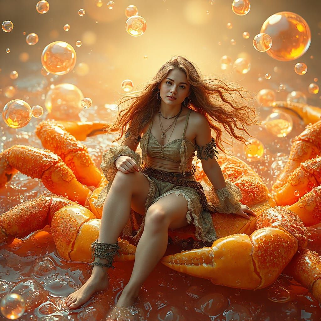 A youthful woman in bohemian attire rests on a giant gummy crab amidst fizzy bubbles in a surreal soda sea. The scene features warm hues and shimmering lights, rendered with delicate textures.