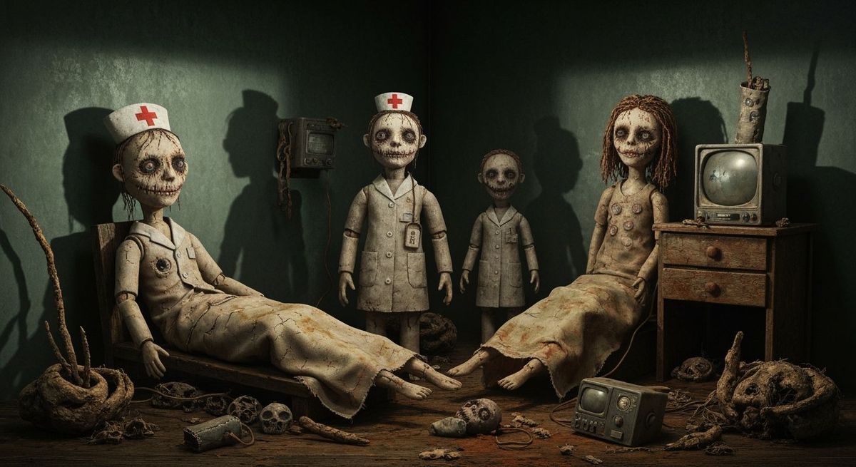 This image depicts a dark psychiatric hospital room with unsettling figures made of cracked clay and burnt wood. It features distorted forms and a haunting atmosphere, rendered in a painterly, cinematic style.