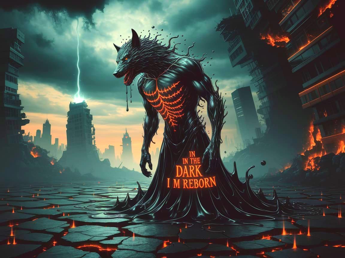 A surreal figure of liquid mercury rises from a desolate landscape as toxic rain falls. The figure, shifting between human and wolf, is marked with glowing runes amid bioluminescent decay. Overall, it's a dark fantasy aesthetic.