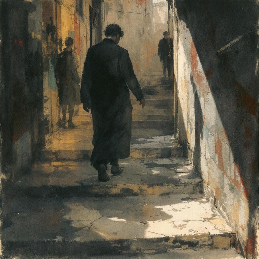 This image shows a figure walking down a street, illuminated by strong chiaroscuro lighting. The vintage aesthetic combines dramatic light with fluid watercolor washes and precise technical linework.