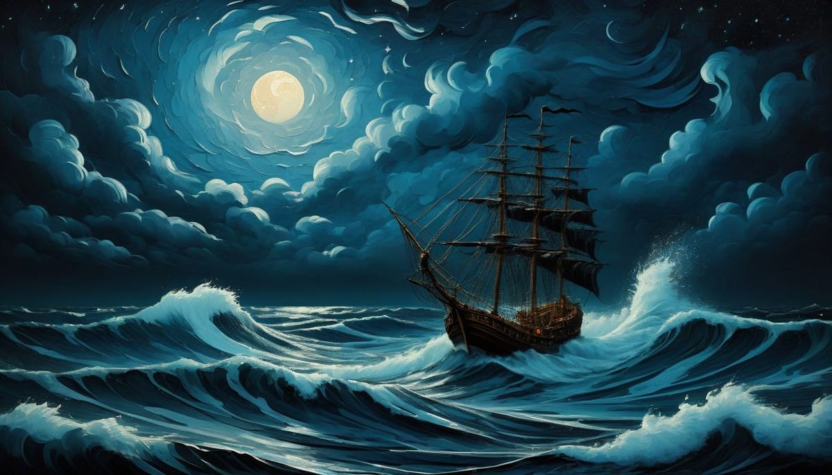 A dramatic painting of a stormy sea under a moonlit sky. This image captures the essence of Baroque art with its rich colors and strong contrasts.