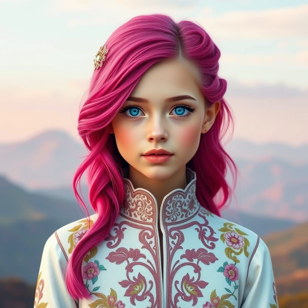 This image shows a young woman with vibrant pink hair and elegant, floral-patterned clothing, set against a soft, dreamy backdrop of rolling mountains and a pastel sky.