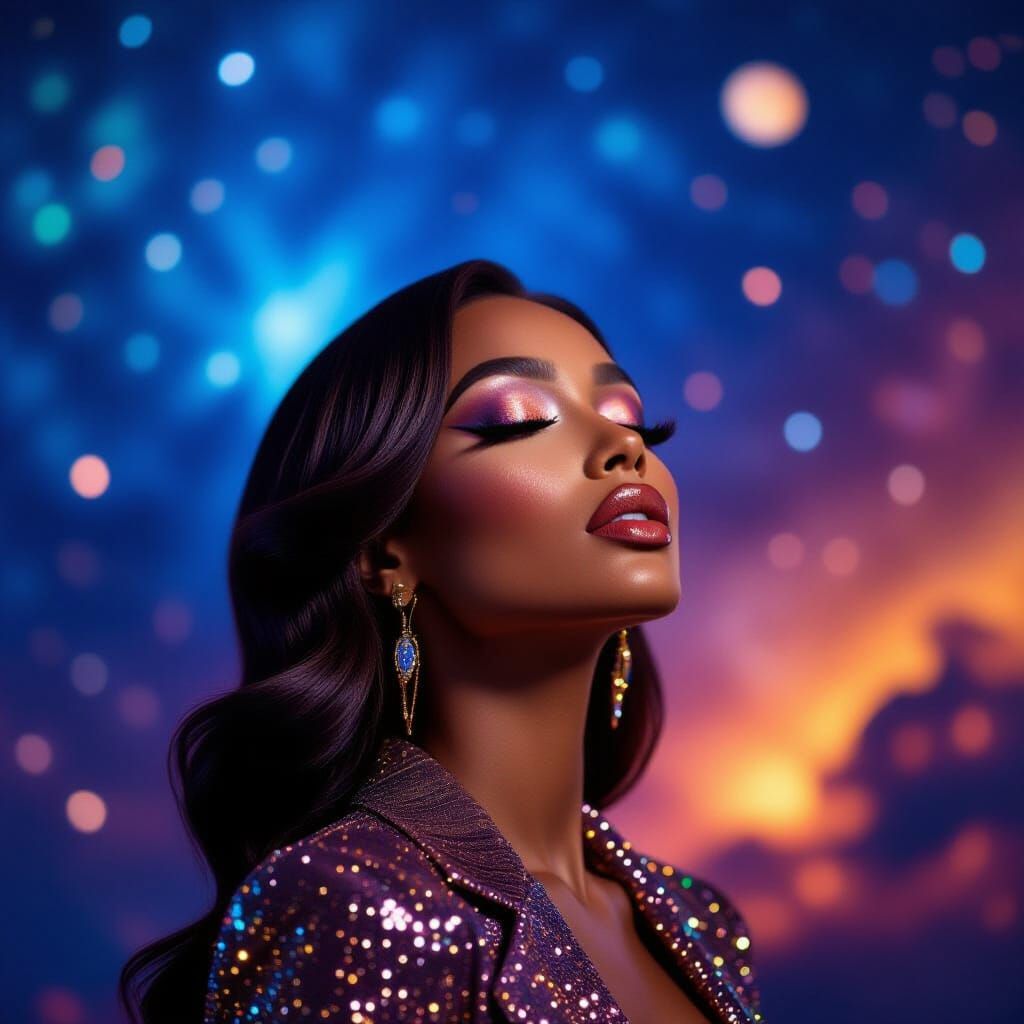 A captivating monochrome portrait of a stylish, brown woman with a sleek hairstyle, dramatic makeup, and a shimmering outfit. Her long, flowing hair merges with a vibrant, colorful cosmic background, adorned with splashes of paint. The woman appears to be tilting her head back, possibly in a moment of ...