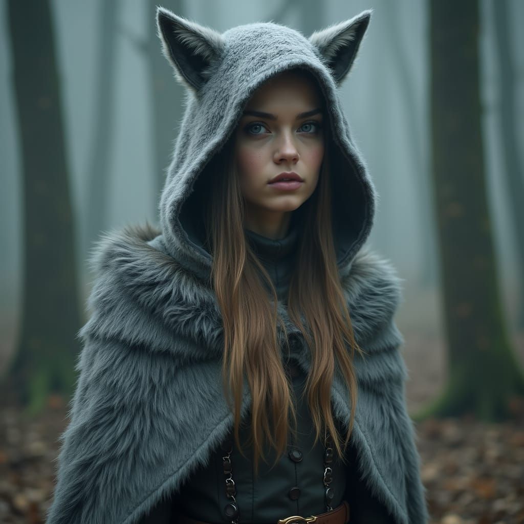 A captivating image of a woman in a wolf cloak amidst a misty forest. The artwork features intricate textures and a muted color palette, with a focus on a painterly aesthetic.