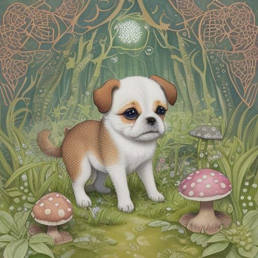 This image shows a cute little dog in a city, juxtaposed with a penny bun mushroom in a forest. The artwork is in a whimsical watercolor style with vibrant, luminous colors and zentangle-inspired patterns.