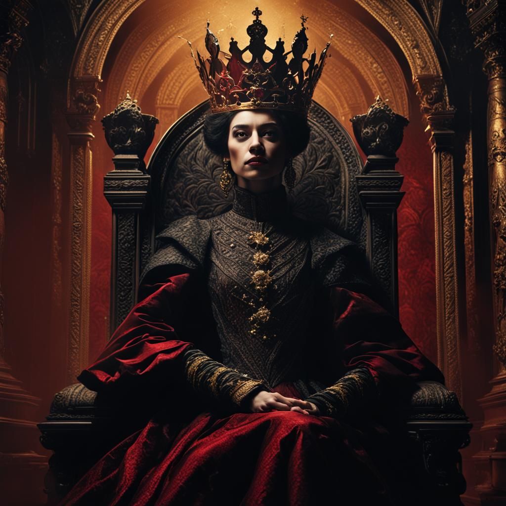 A striking portrait of a dark fantasy queen on her throne. The image evokes a mysterious, regal atmosphere with dramatic lighting, rich colors and high contrast, in a style reminiscent of dark fantasy art.