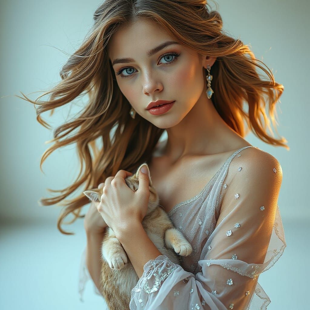 This image shows a beautiful woman with flowing light brown hair and blue eyes, wearing a starlight gown while holding a cat. The hyperrealistic digital art features vibrant colors and cinematic atmosphere.