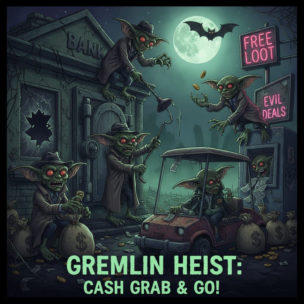 This image depicts mischievous gremlins engaged in a nighttime bank heist, blending horror and humor in a chaotic scene.