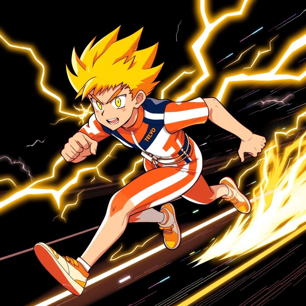 This image shows an anime-style runner with striking yellow-orange hair and eyes, wearing a thunderbolt-themed uniform. Electric bolts emanate from him as he sprints along a glowing track with dynamic speed.