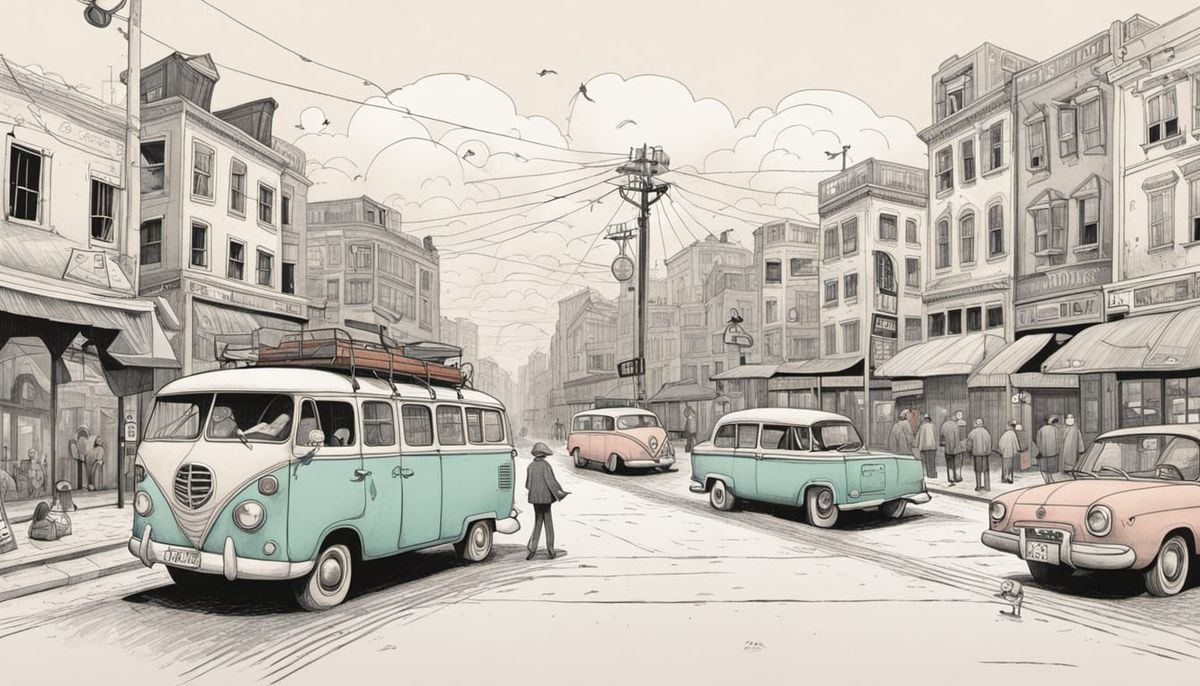 This image depicts a surreal urban scene rendered with delicate pencil shading and soft pastel colors. It features whimsical characters, strange creatures and absurd vehicles in a balanced composition.