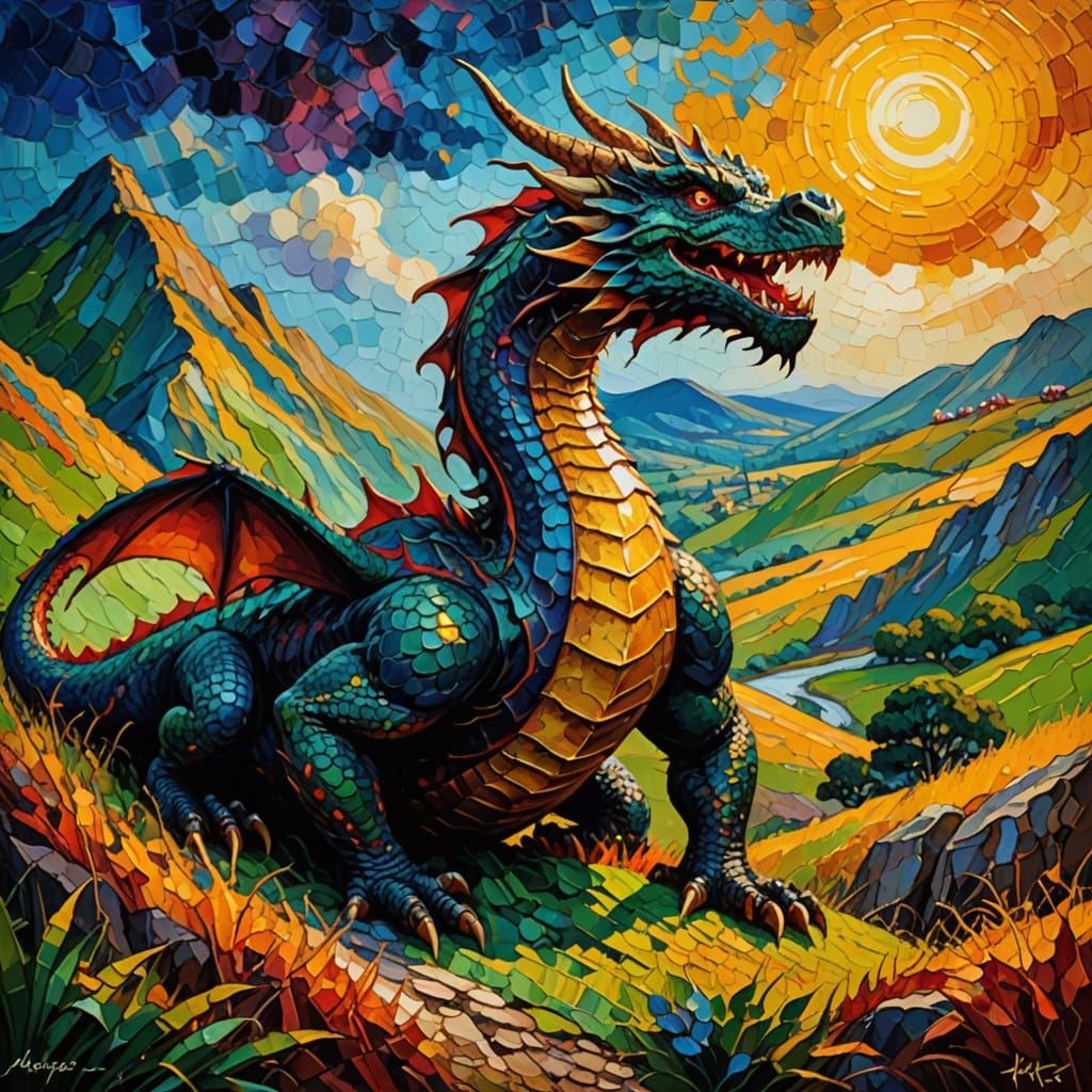 A vibrant oil painting of a dragon awakening under a grassy hill, bathed in warm golden light. The image features bold colors and thick impasto layers, creating a moody and atmospheric fantasy scene.