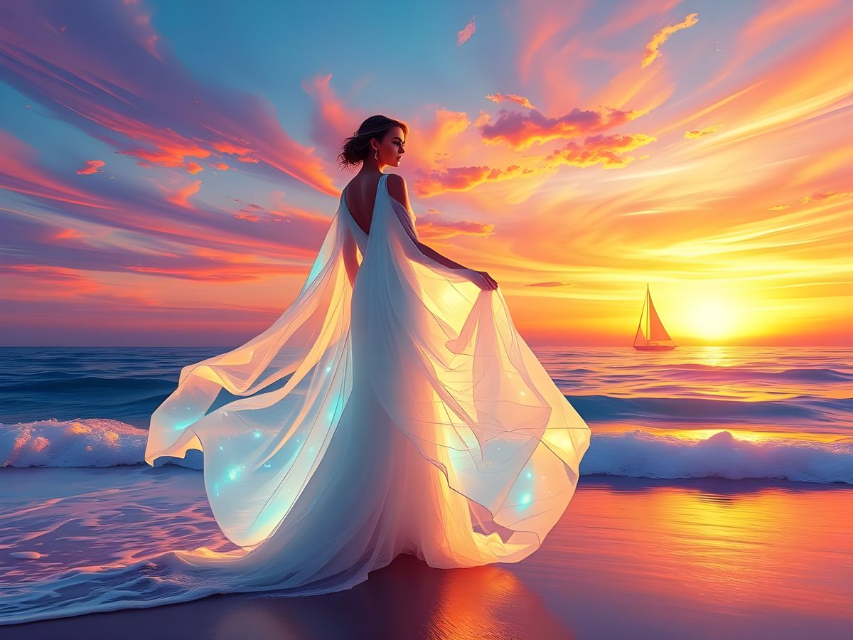 A beautiful woman stands on a shore, surrounded by rippling waves and sun rays. She wears a translucent light dress in a gradient of opal, blue, and purple hues, evoking a sense of refined tenderness and airiness.