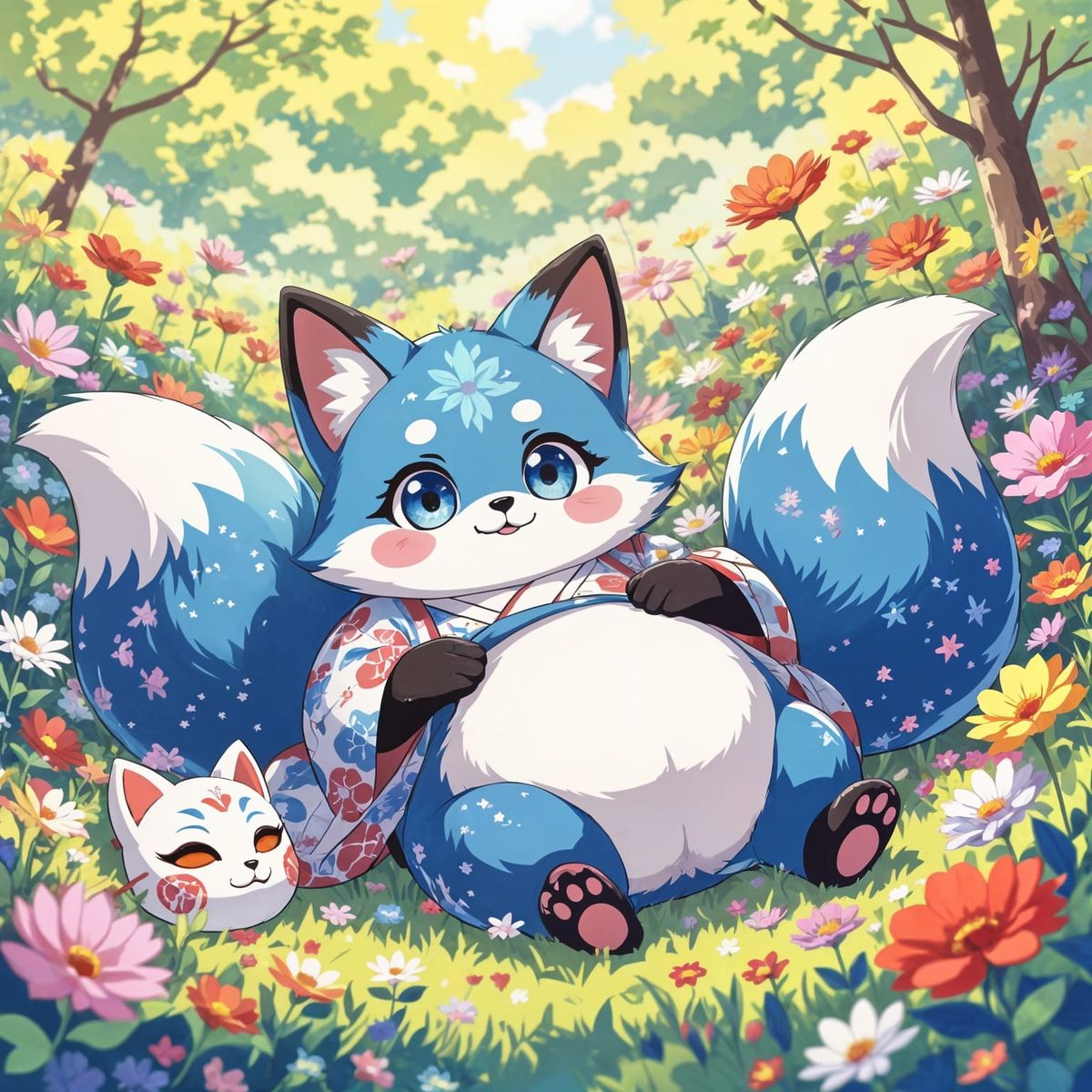 This image shows a chubby blue fox with galaxy-themed tails relaxing in a surreal flower garden. The cute fox, rendered in a Ghibli-esque style, has big anime eyes and a kabuki mask.