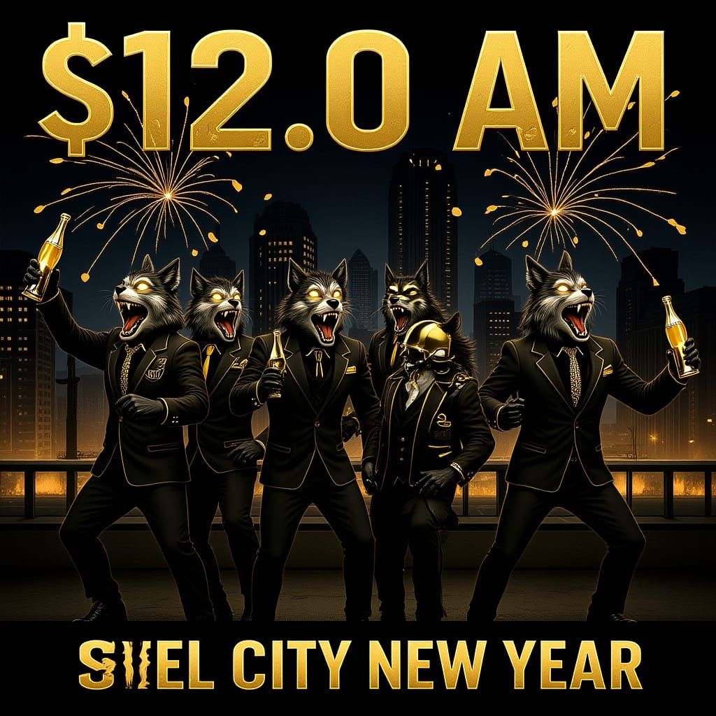This image depicts anthropomorphic wolves in luxury party attire celebrating New Year's Eve on a Pittsburgh rooftop. Fireworks and city lights illuminate the scene with a championship energy.