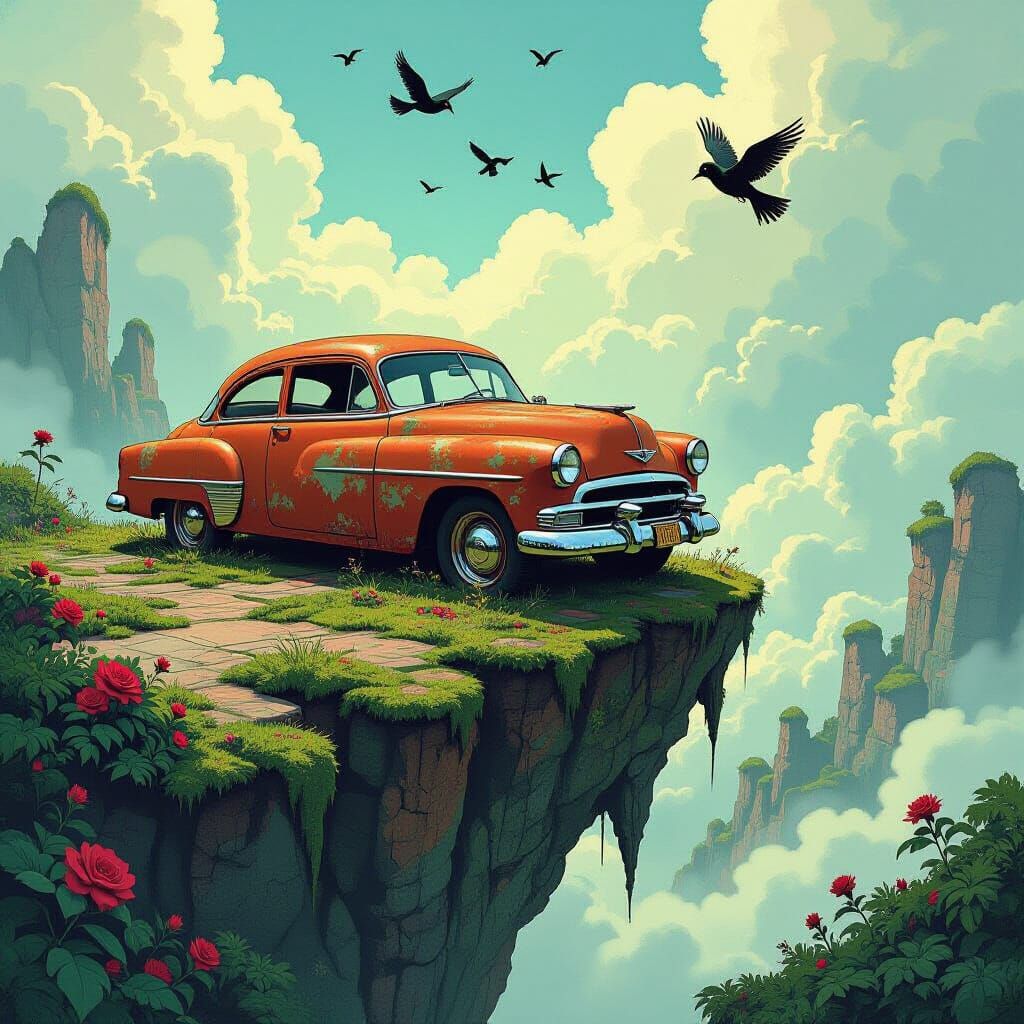 A vintage car, rusted and overgrown with moss, parked precariously on the edge of a floating island