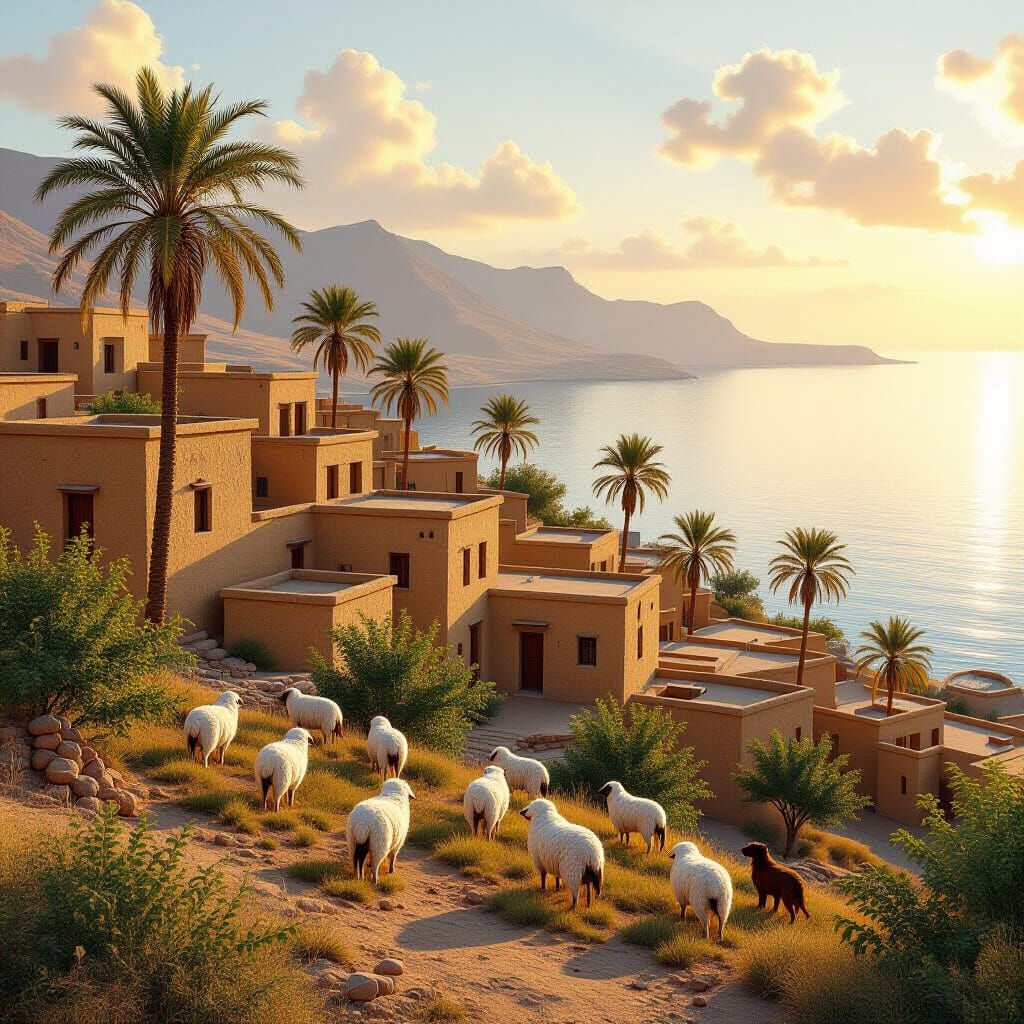 This image depicts a serene, ancient Arab village on a hillside, facing a tranquil sea. Warm afternoon light illuminates mud-brick houses and palm trees, with sheep and dogs nearby. The style evokes detailed, atmospheric orientalist landscape paintings.