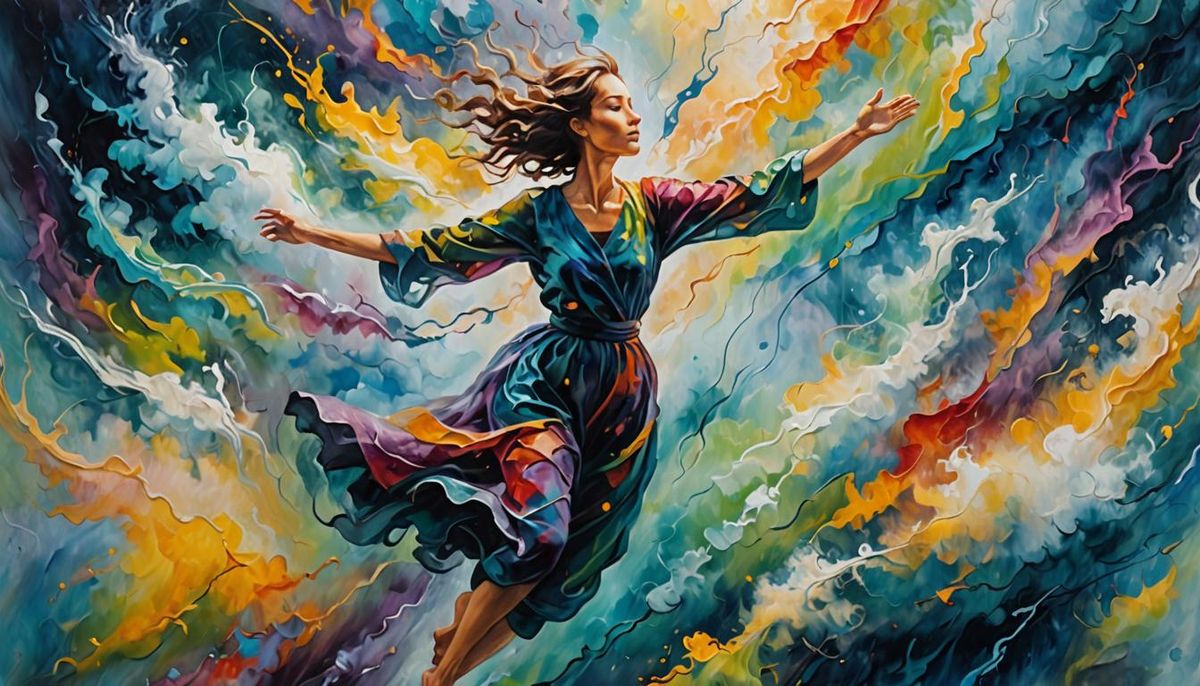 A surreal image of a person levitating amidst swirling mist, created in an abstract expressionist style. The vibrant oil painting uses impasto textures and shimmering, iridescent colors to create a dreamy atmosphere.
