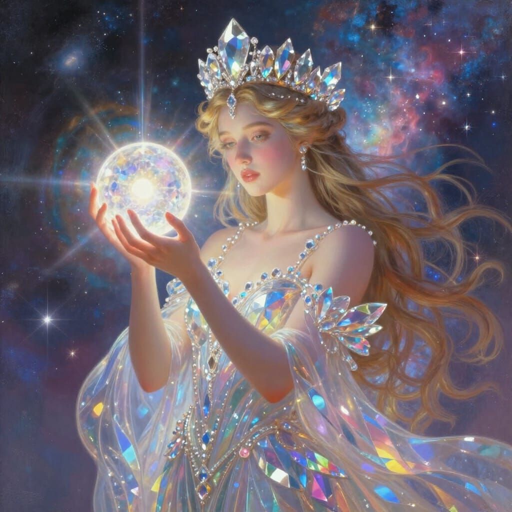 A radiant goddess adorned with a crystal crown and holding a glowing orb. This digital painting features shimmering textures and prismatic light effects against a cosmic backdrop.