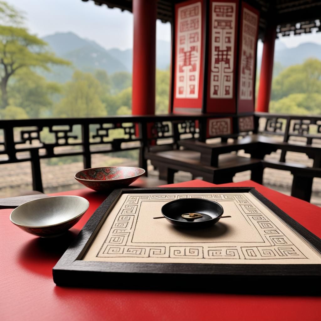 This image shows an ancient Chinese magnetic compass resting on a table with old manuscripts. The scene is set inside a traditional red, white, and black Chinese house, offering a view into a serene garden.