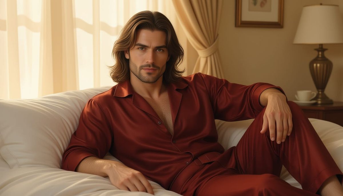 This image shows a handsome man with long auburn hair reclining on a bed in silk pajamas. The soft lighting and serene bedroom create a warm, inviting atmosphere, reminiscent of digital painting.