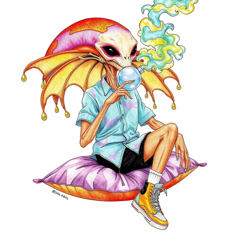 This image shows a tall, slender alien creature with shimmering skin and long, clawed fingers, set against a backdrop of glowing, psychedelic bubbles in a contemporary occult style.