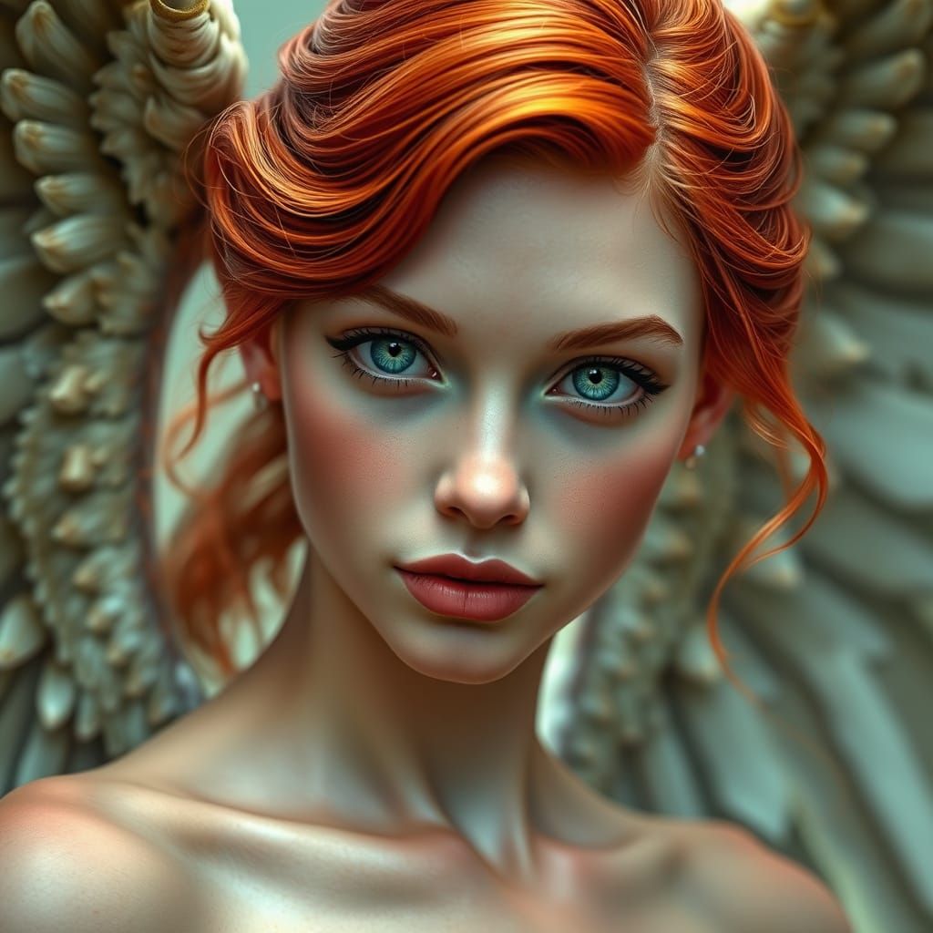 This image showcases a close-up portrait of an angel with striking red hair and piercing green eyes. Her stunning wings emerge from her back, depicted in exquisite detail with realistic shading techniques.