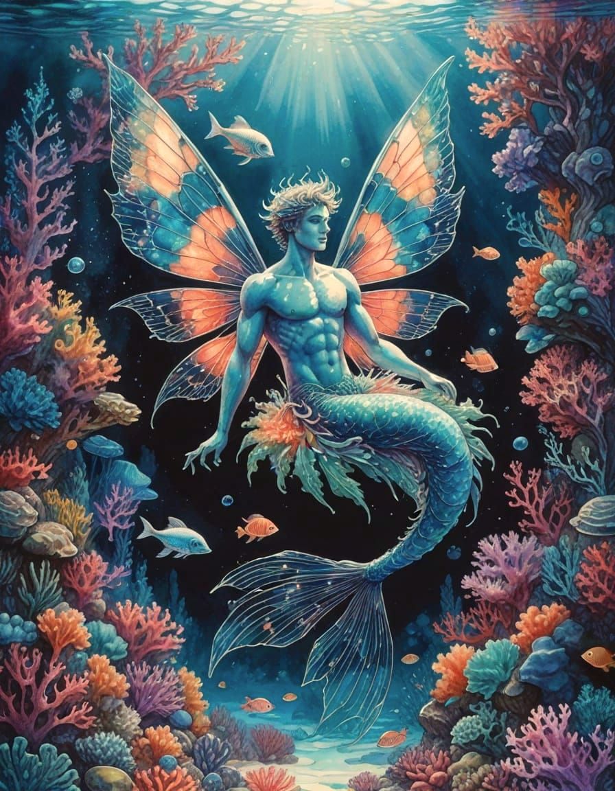 This image shows a celestial merman fairy swimming through a vibrant coral reef. The image is a detailed watercolor and ink painting with ornate details, bioluminescent flora, and a mystical aura.