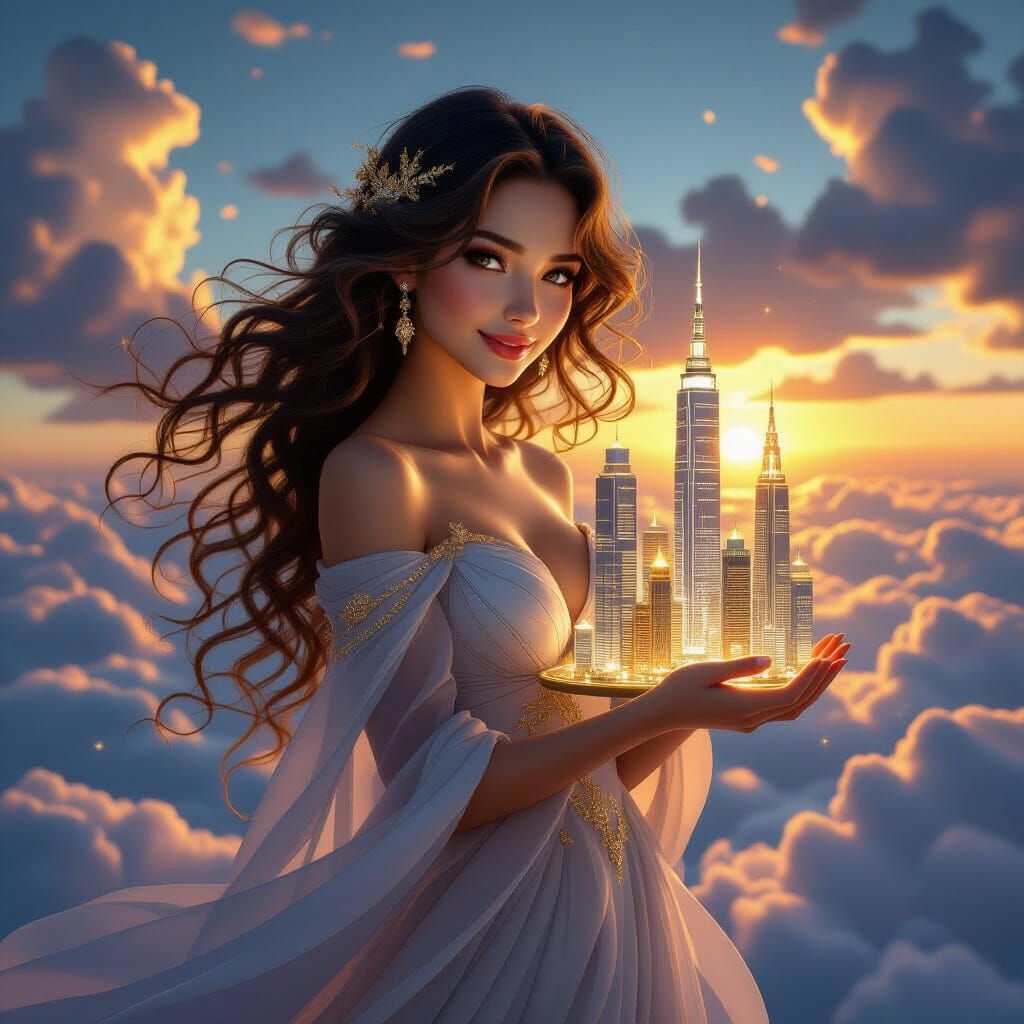 A striking picture of a smiling woman with long, curly hair holding a miniature city among swirling clouds. The image evokes a surreal and mystical atmosphere with gold and diamond elements as 3D rendered digital art.