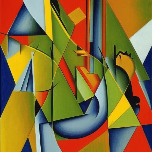 A cubist abstract image of a lion made of asparagus. The artwork features Euclidean shapes and bold colors.