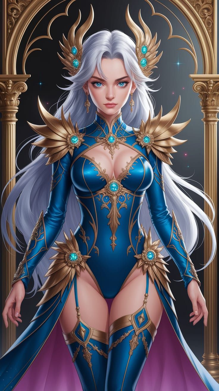 A digital anime drawing of Zuri in a hallway with an intentionally messy updo. Her dress has gold accents and ice-blue glitter, with a long slit revealing her legs.