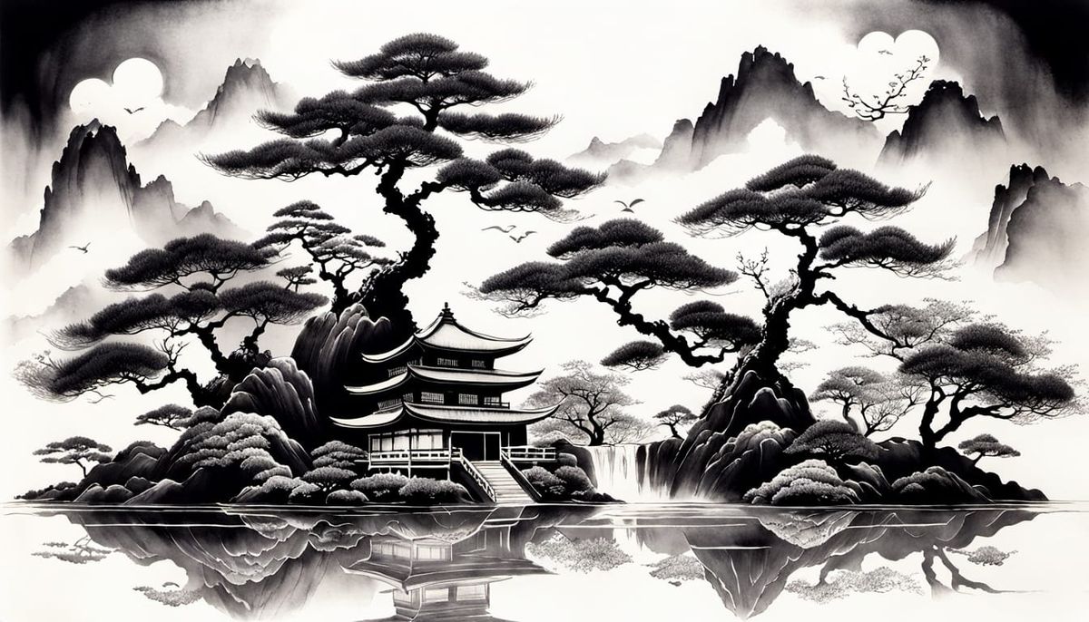 Floating Bonzai Garden; Japanese Sumi-e, Ornate, Mineral pigments, Retro, Black and white, Yuumei; Masahiko Kimura