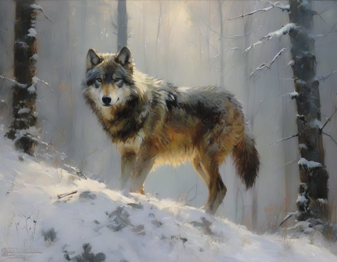 This image shows a wolf in a snowy, foggy forest. It is rendered as an oil painting with dramatic lighting and visible brushstroke textures.