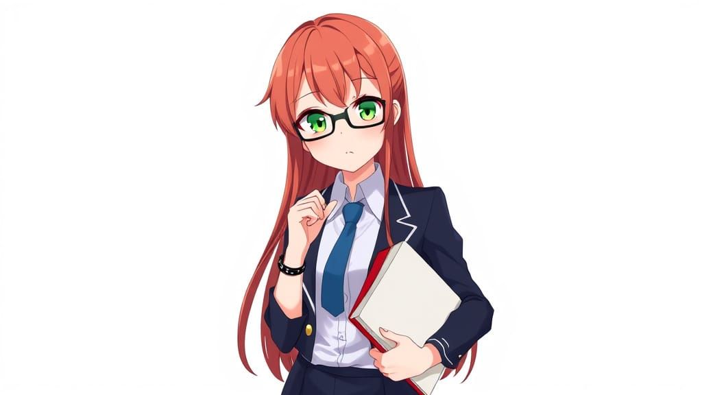This image shows a surprised young woman with long red hair and green eyes, wearing a dark blue blazer and skirt. She holds books against a simple white backdrop in this AI-generated composition.