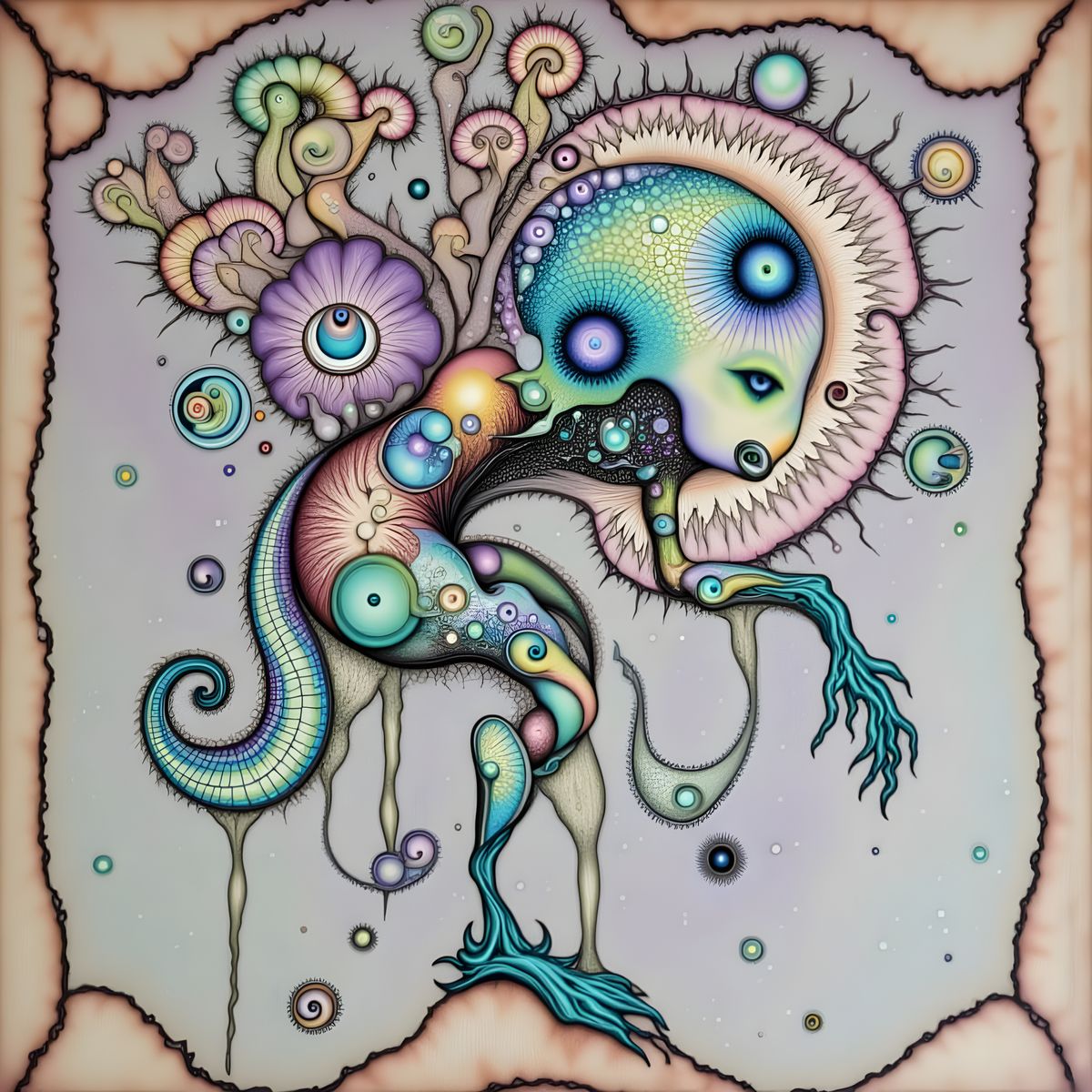 This image showcases bizarre, intricately patterned hybrid creatures exploring a unique game world of bridges and auditoriums, rendered with a photorealistic alcohol ink style.