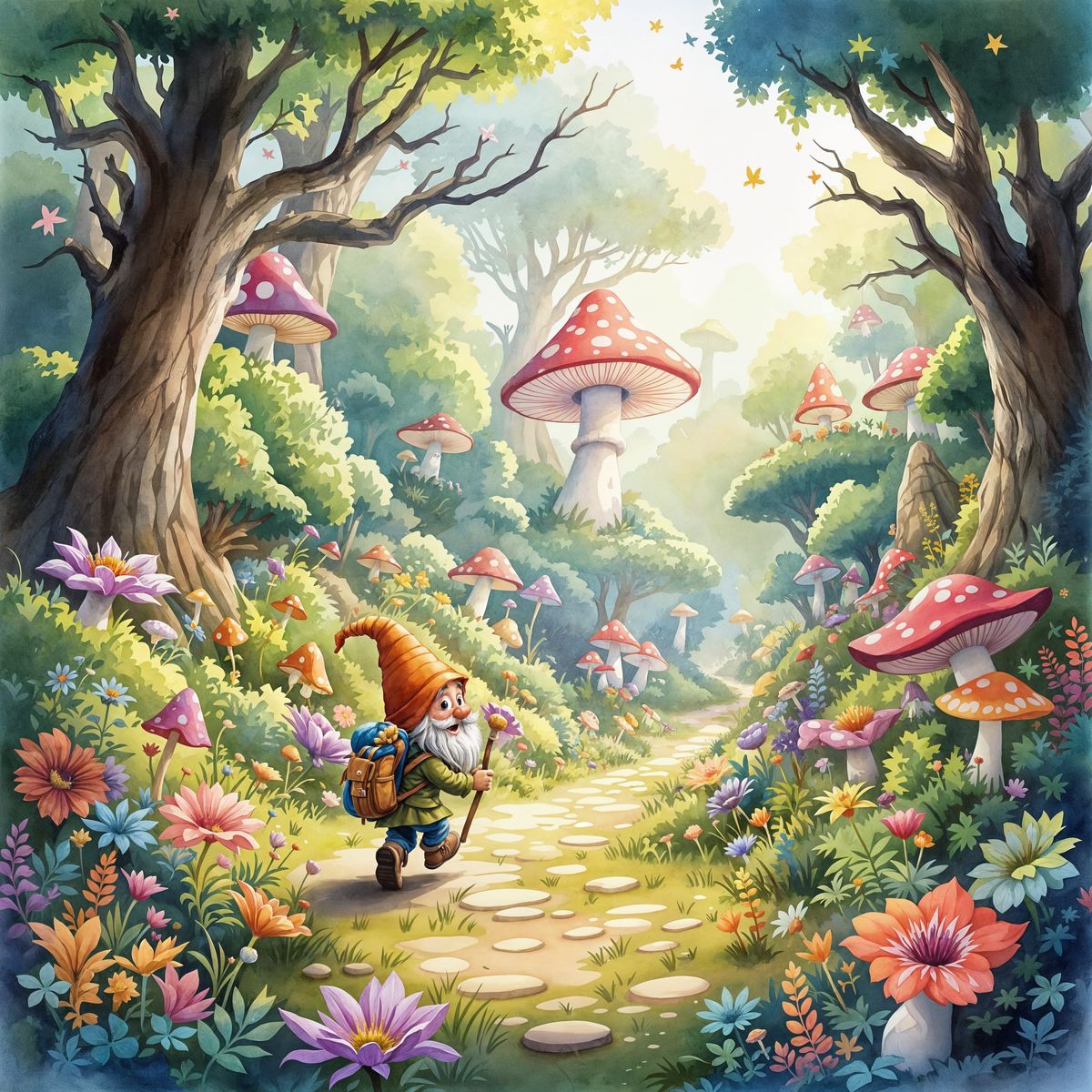 This enchanting watercolor illustration captures a charming gnome's journey through a fantastical forest, teeming with color and whimsy, featuring lush trees, playful flowers, and stylized mushroom formations.