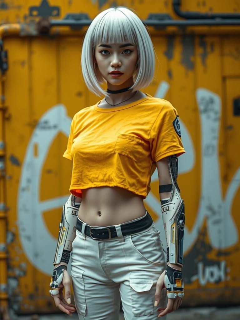 This hyperrealistic image shows a beautiful female cyborg with a platinum bob haircut against a weathered yellow wall with white graffiti. She wears a distressed crop-top and tactical pants, featuring intricate cybernetic details.