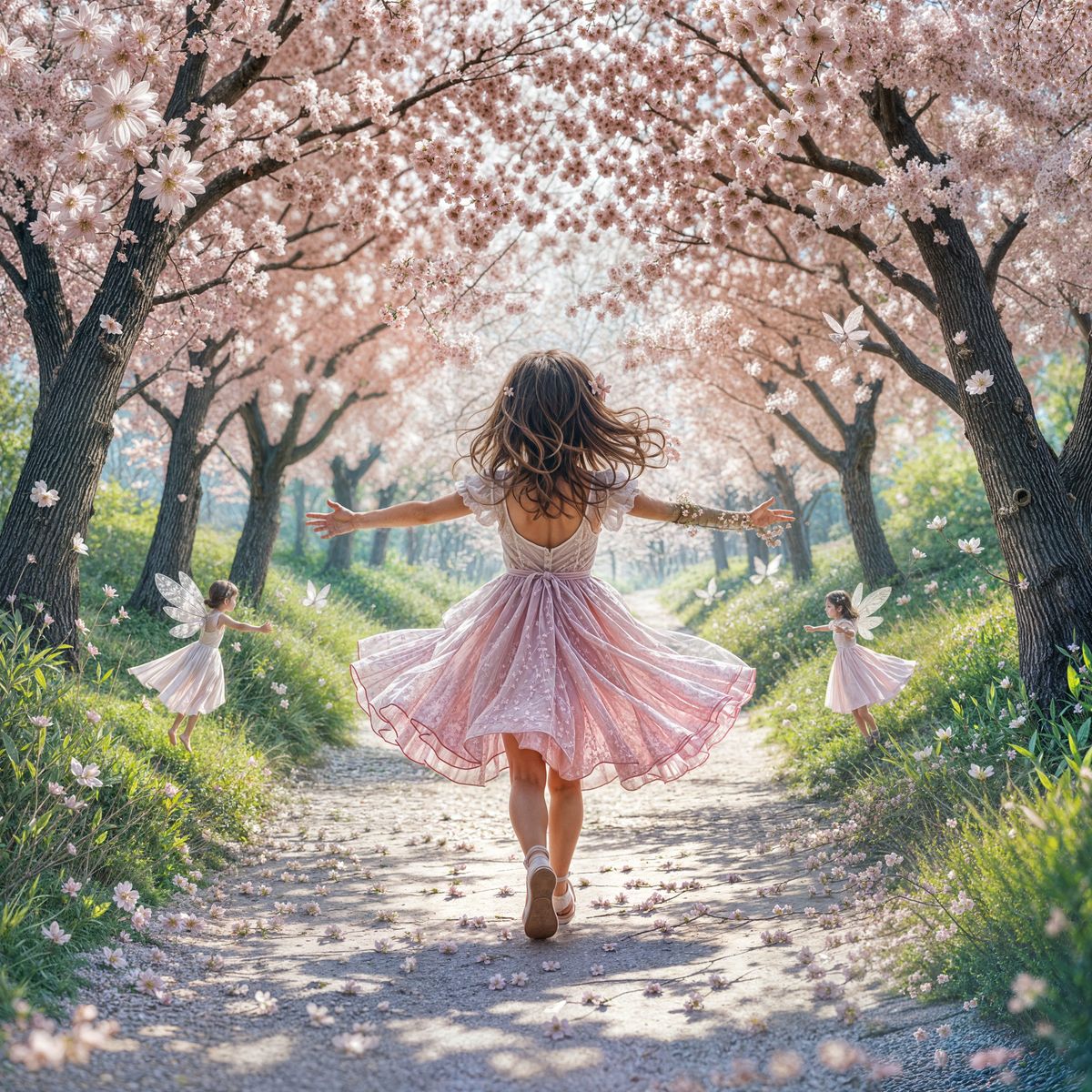 A serene image of a cherry blossom path with fairies. A little girl with outstretched arms runs towards her mother, rendered with a soft, dreamy aesthetic.