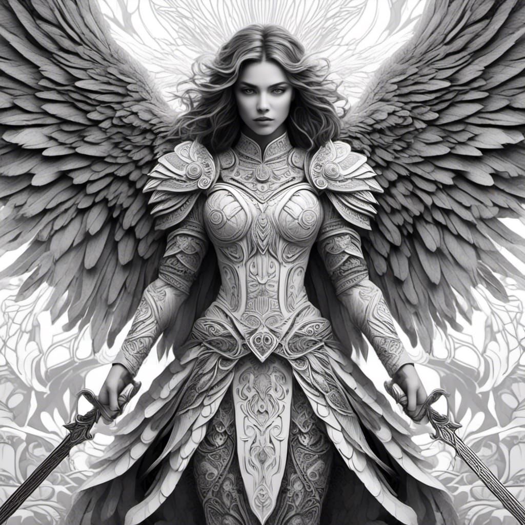 A black and white coloring book page featuring a winged woman with a sword in a mandala style. The ultra-detailed line art printable design has strong outlines and geometric forms.