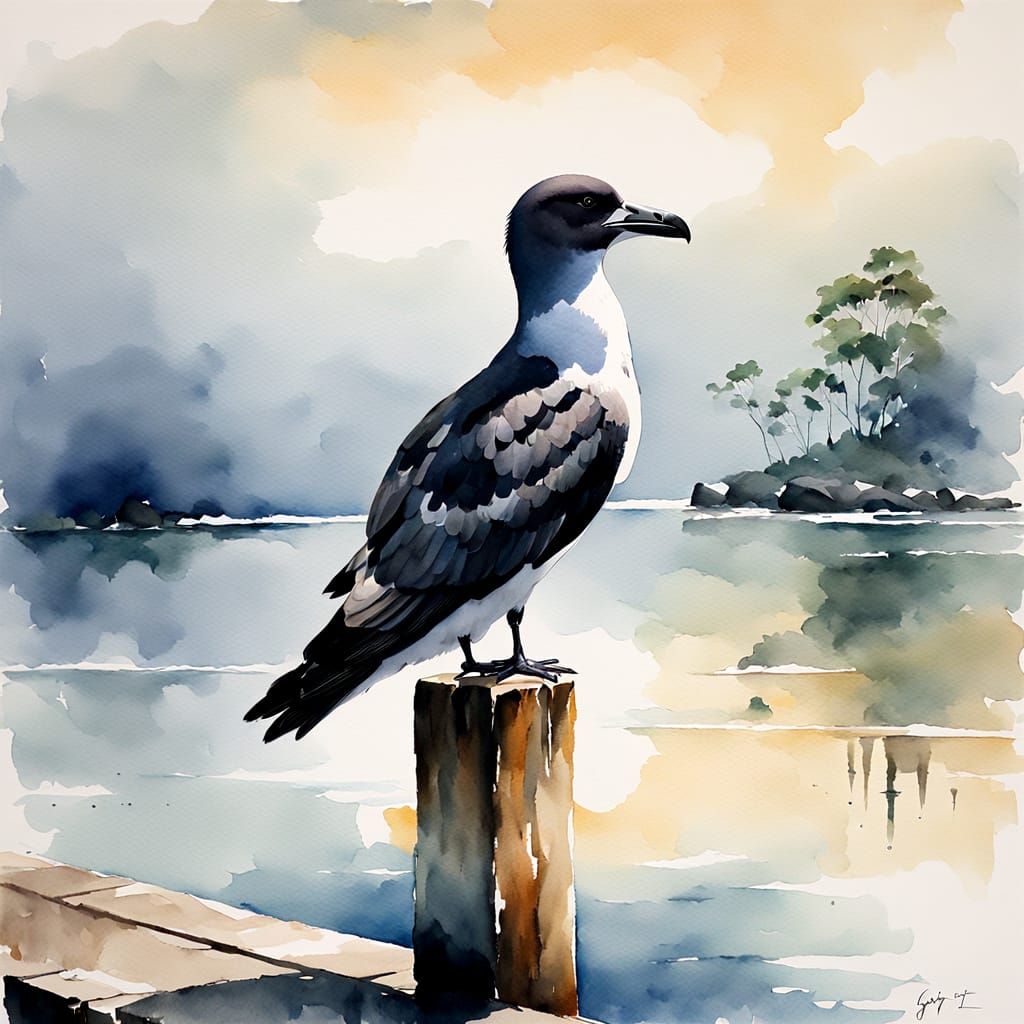 This image shows a petrel resting on a wooden jetty post, captured in a loose, impressionistic watercolor style with soft edges and blended colors. Evocative washes create a serene mood.