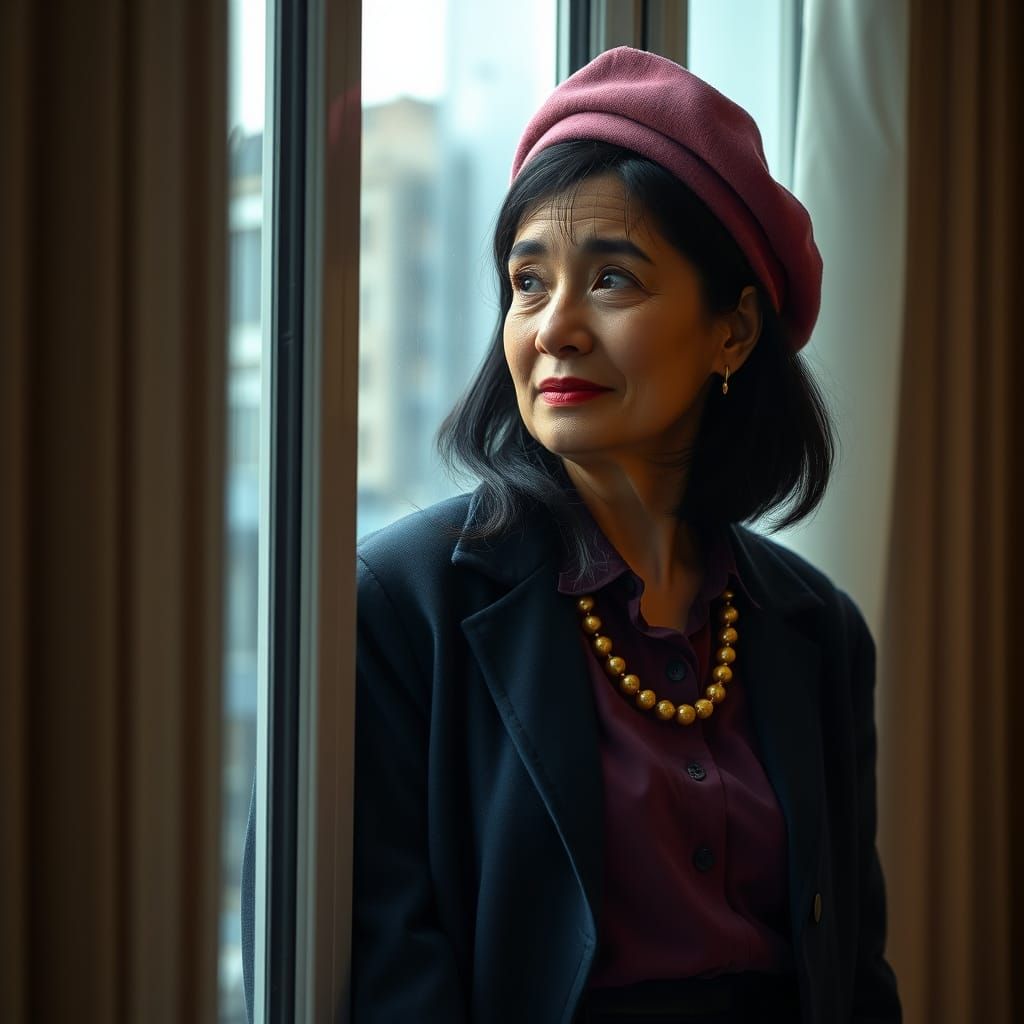 This photorealistic image shows a middle-aged woman with a wistful expression, wearing a pink beret and gold jewelry. Cinematic lighting creates a romantic atmosphere.