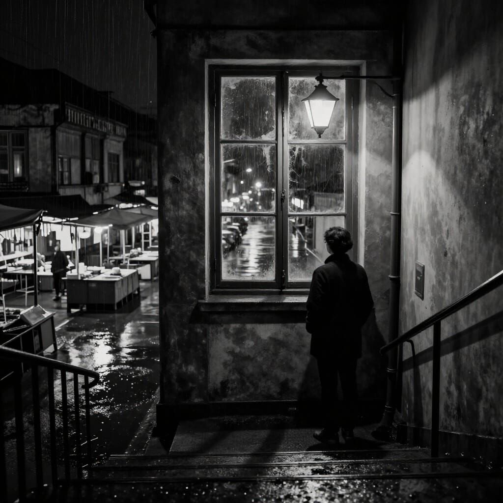 This image shows a solitary figure on a dark staircase, gazing out a grimy window at a wet city street. The minimalist style emphasizes stark lines and a moody, introspective atmosphere.