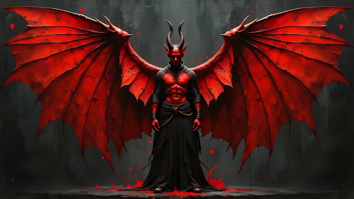 lora:Tiefling:1.0 red skin, male, tiefling with horns and majestic wings, made of <lora:MJ6 Dark Oil Paint:1.0> oil paint, splashes of pai...