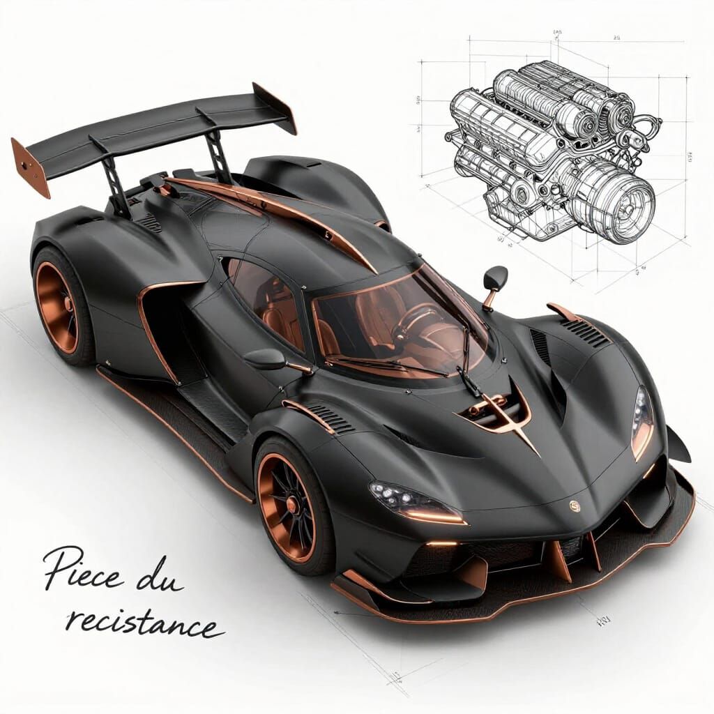 This image features a detailed blueprint of a widebody steampunk hypercar. Matte black and copper brown colors highlight intricate line work and glowing elements, in a precision drafting style.
