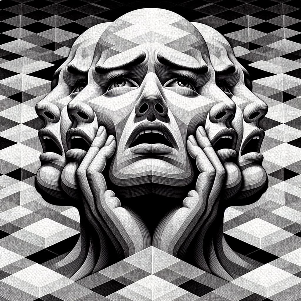 tessellated pattern that represents the agony of her soul caught in a moment of dramatic pause her facial expression changes as she realises something about a vanishing point trompe l'oeil she just wants that time back again therefore she's shaved her head