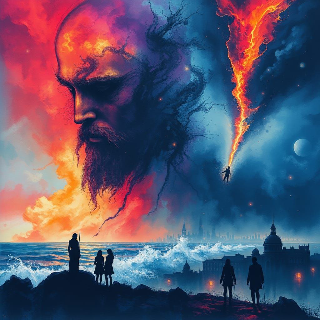 This image shows the face of Jesus in smoke, women on a shore during a storm, and a comet over a city, all in fluorescent colors. The artwork has a batik, abstract, and surreal expressionist style.