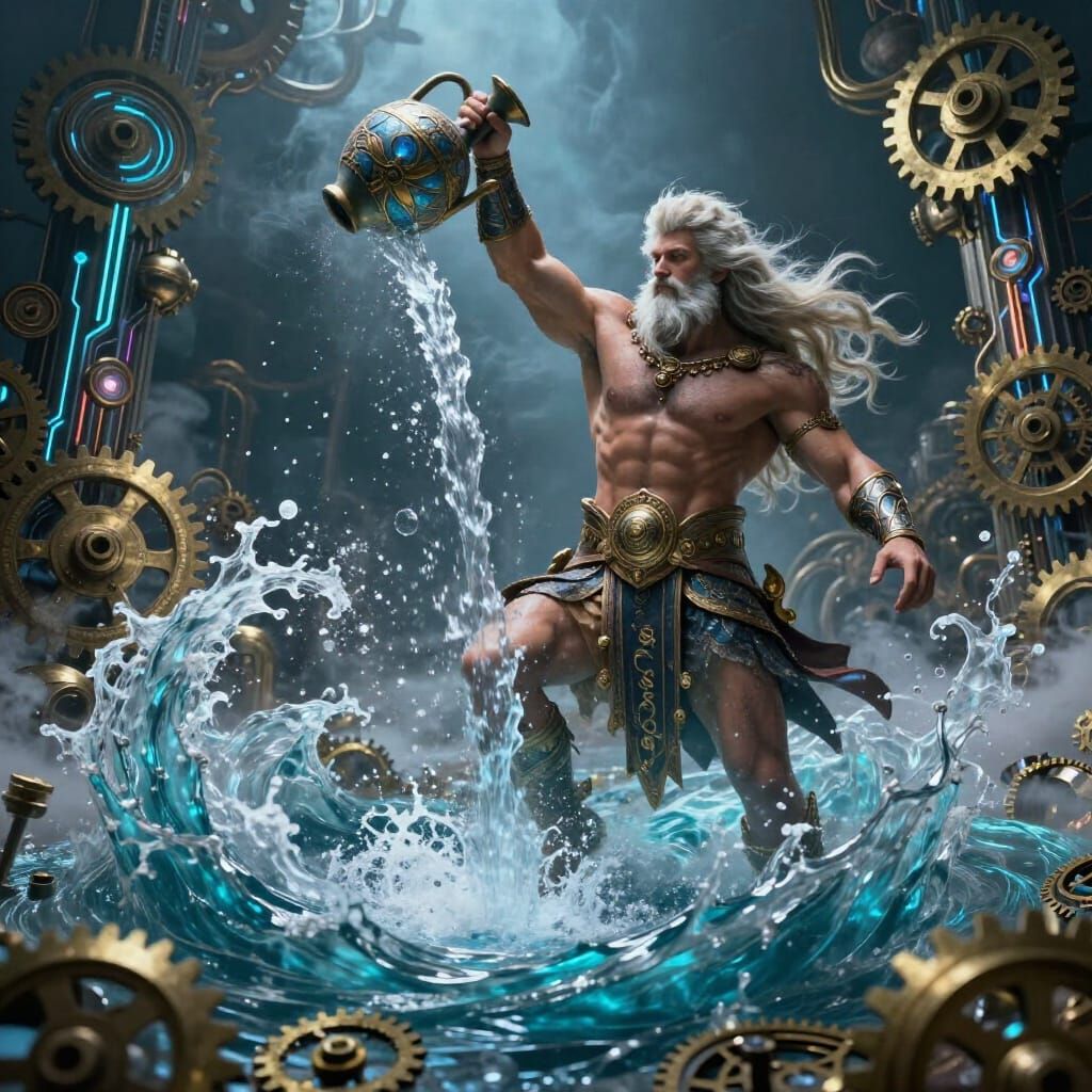 This hyperrealistic image shows a warrior embodying Aquarius, pouring a cosmic river from an ornate jug into a swirling vortex, blending steampunk and futuristic styles.